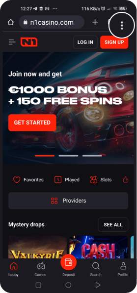 Mene N1-kotisivulle, napauta kolmea pistettä ja avaa selainvalikko.